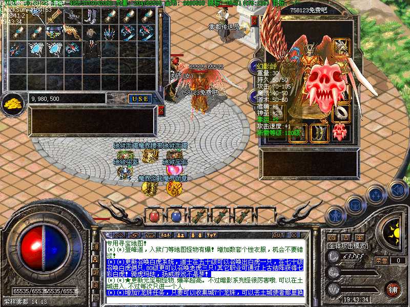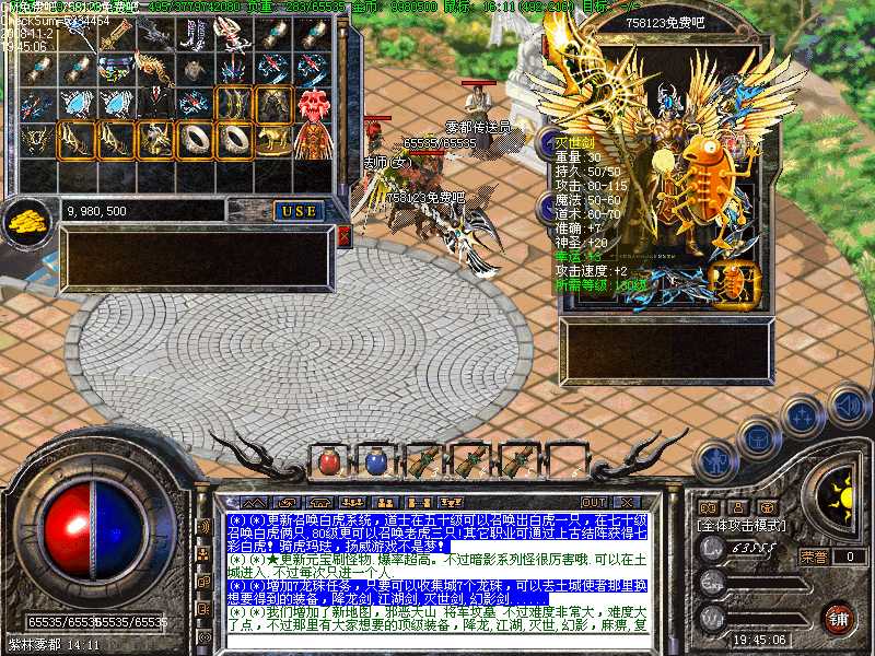 B(*)增加7龙珠任务,只要可以收集城7个龙珠,可以去土城使者那里换想要得到的装备,降龙剑,江湖剑,灭世剑,幻影剑......