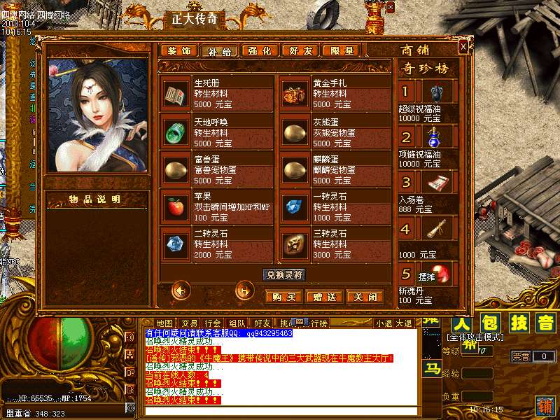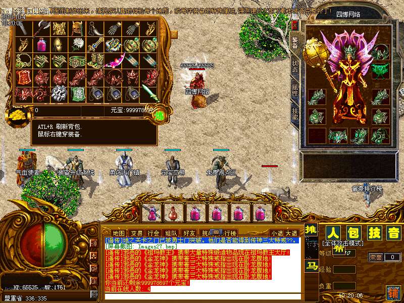 三:最新加入神秘古城事件 可以通过盟重传送员进入打开 装备地图就可以很清楚的看见[古城传送],神秘古城可以查询古城NPC他会提示您怎么 才能进入一个未知的世界那里面可以爆出高级装备爆率高。