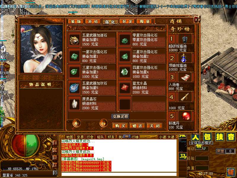 五:最新加入 月光宝盒 在土城药店下面 每一个小时将会刷出一个月光宝盒 而这个月光宝盒他不会攻击任何人 神秘中的传闻不知道是真是假据说在很久以前就已经有的这种传闻玛法大陆的居民为了打开这个秘密砍破月光宝盒神秘中的英雄就这样消失据说是被月光宝盒通过时光轮回的隧道传入一个未知的世界中去。
