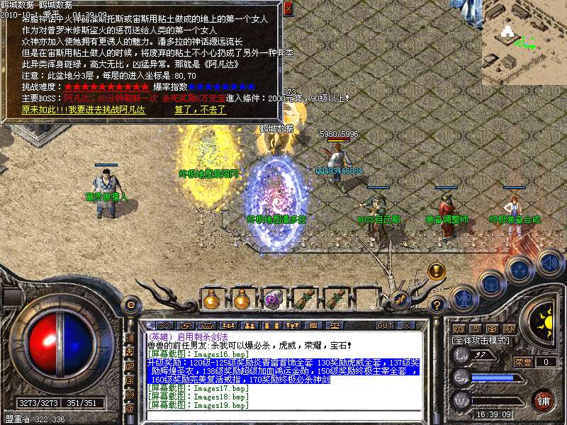 升级奖励:120级-125级奖励炎青雷首饰全套 130奖励虎威全套,137级奖励辉煌圣衣,138级奖励超级加血鸿运金勋,150级奖励终极主宰全套 ,160级奖励完美复活戒指,170奖励终极必杀神剑申请天下第一,天下第一上线享受1.2倍攻击!!
