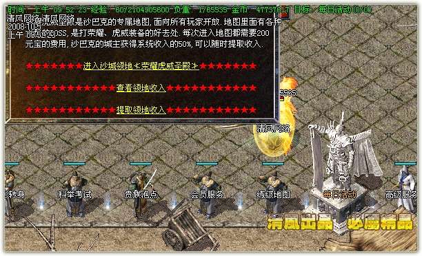 【领地收入】沙巴克的专用领地。玩家进入需要付200元宝.城主可以随时提款50%的元宝