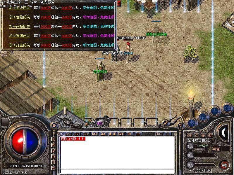 *╔─┬───────────────────────────╗│★│ 安全闭关 每秒1000万经验 2000万内功 ││免│ 危险闭关 每秒1400万经验 2800万内功 ││费│ 赌博闭关 每秒2800万经验 5000万内功 ││★│ 色情闭关 每秒2500万经验 4000万内功 ││★│ 绝望闭关 每秒1500万经验 3000万内功 ││闭│ 打宝闭关 每秒1000万经验 2000万内功 ││关│ ││★│ 以上闭关地图,全部为免费,不收取任何费用 │╚─┴───────────────────────────╝