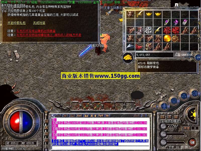 2.新增加终极礼包!双击使用!但是需要100元宝作为开启费用,可开出王者、幻神装备,及五大神戒!!