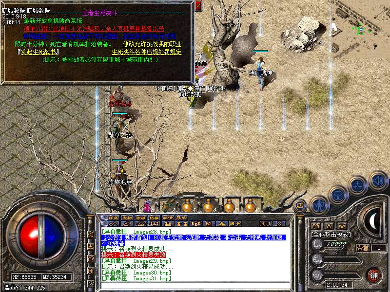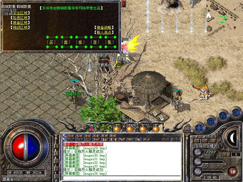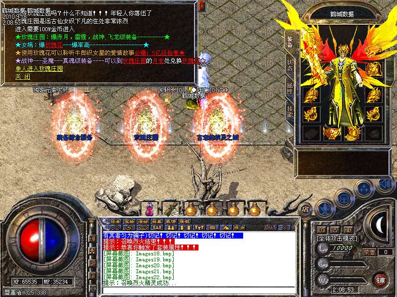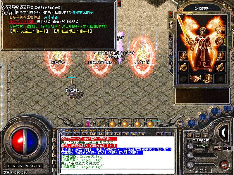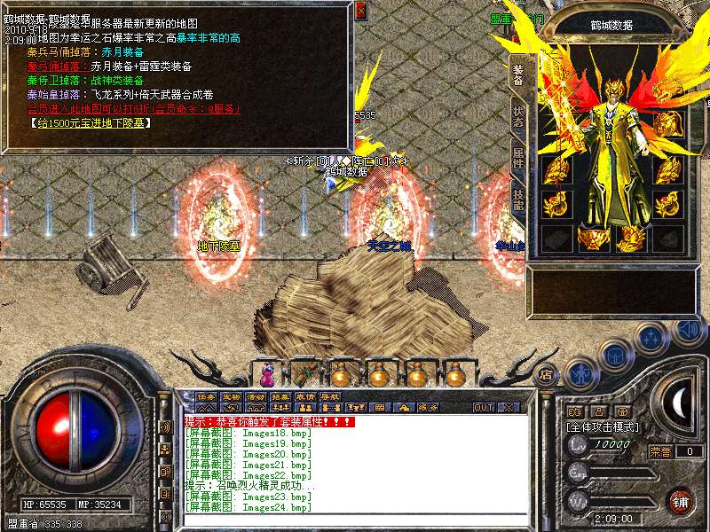 服务器在幻境7层,魔龙血域,袄玛3层,王者天堂,荣誉之城,寂静3层,地下陵墓每小时刷3到5只魔龙教主!爆战神开天装备喔!别错过!寂静1到3层是新人混装备元宝的最好地方。
