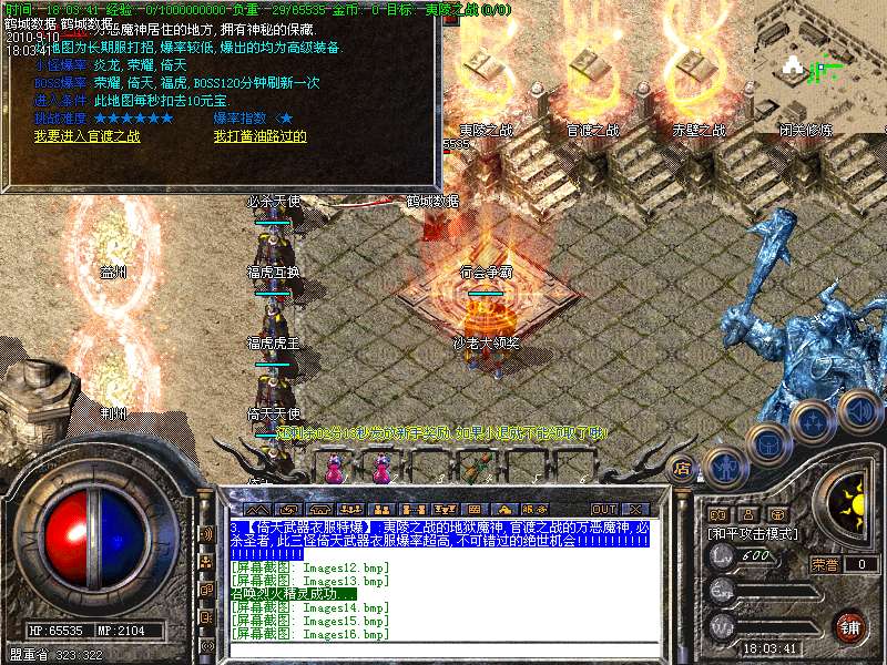 5.【怪物爆率】: 盛大各类教主爆荣耀类装备,魔龙教主,暗之魔龙教主,教皇,蚩尤,赤月恶魔,玛法教皇,雪域魔王....此类教主都有机会爆倚天类装备,荆州,夷陵,益州,白帝城,官渡,赤壁,会员地,倚天,福虎爆率高,顶级装备靠大家花时间就能得到,免费玩家也是顶级套