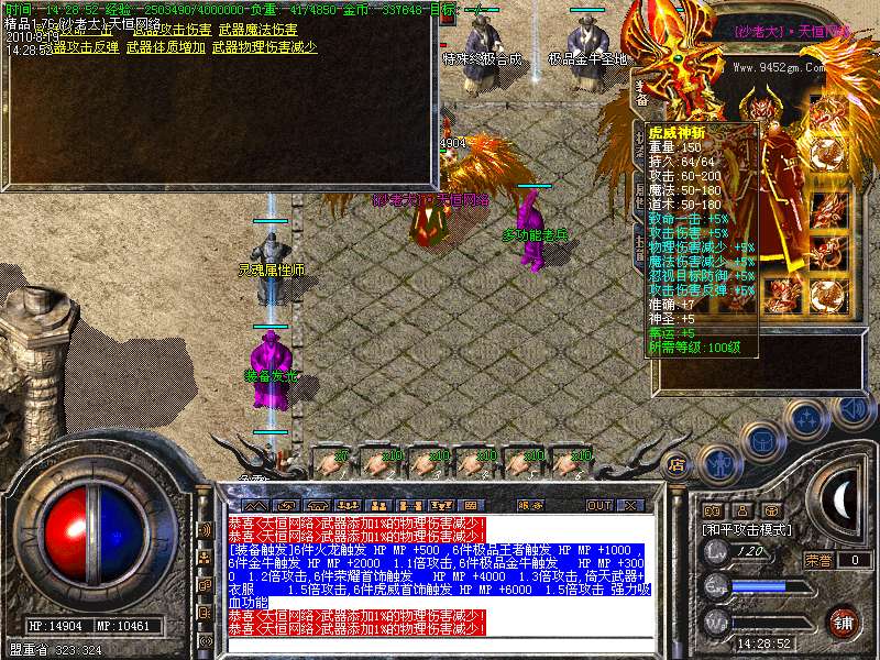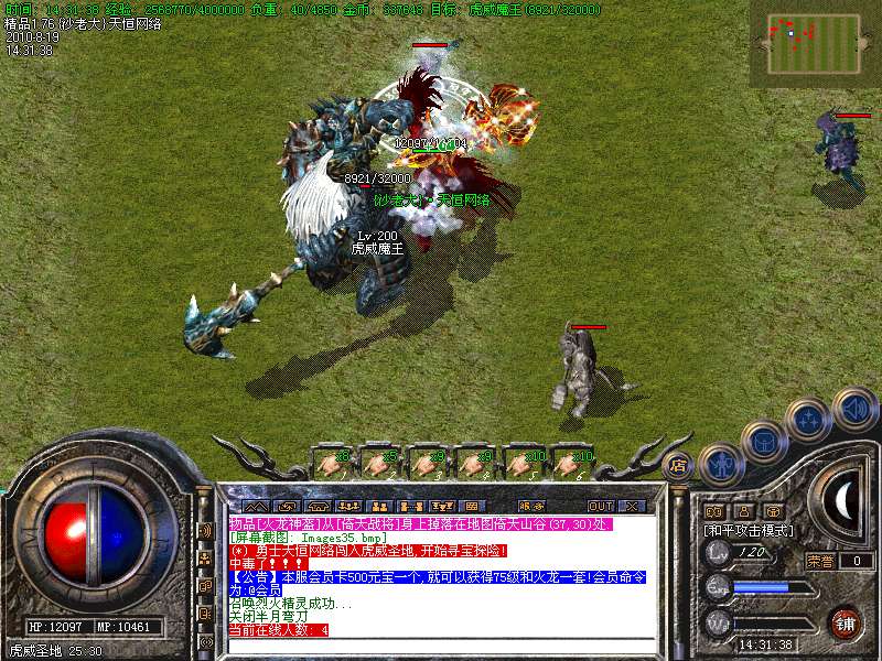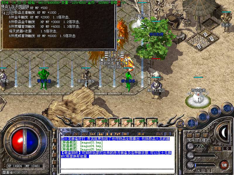 [装备触发]6件火龙触发 HP MP +500 ,6件极品王者触发 HP MP +1000 ,6件金牛触发 HP MP +2000 1.1倍攻击,6件极品金牛触发 HP MP +3000 1.2倍攻击,6件荣耀首饰触发 HP MP +4000 1.3倍攻击,倚天武器+衣服 1.5倍攻击,6件虎威首饰触发 HP MP +6000 1.5倍攻击 强力吸血功能