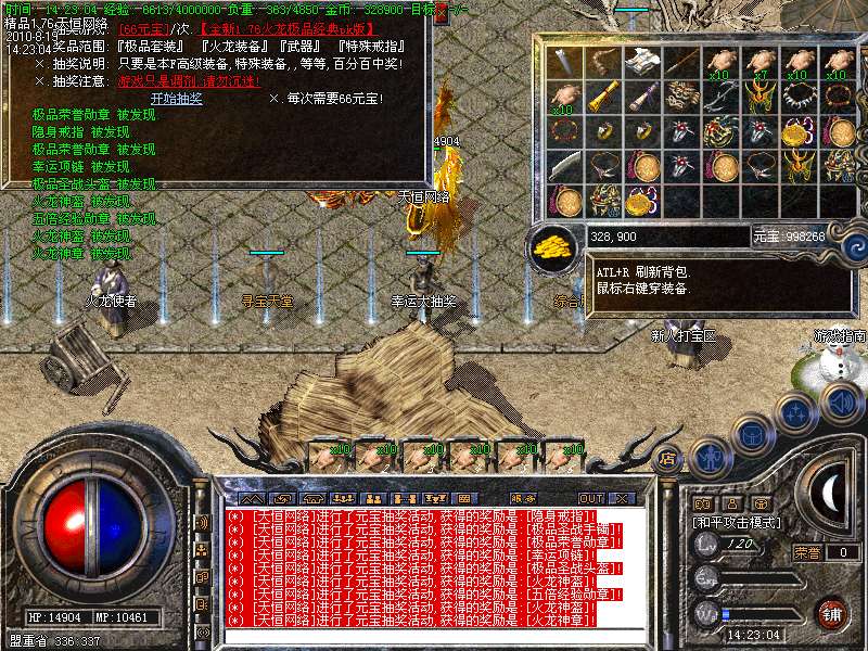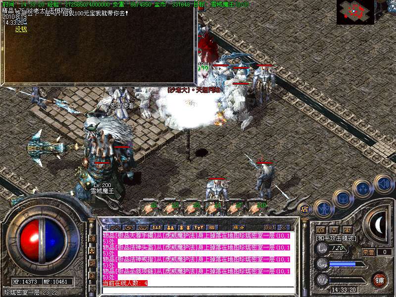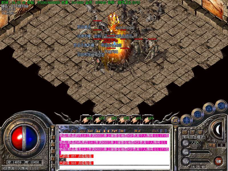 【精心爆率】经过我们技术人员的精心测试调整,爆率非常合理.服务器所有装备都能爆出,更是把BOSS爆率放在第一重点.注重BOSS爆率,绝对不会给你感觉到不爆赤月装备的无奈,同时也不会感觉到装备乱爆赤月的无趣.只要你有足够的实力,赤月装备绝对不是梦想!服务器的爆率为满足散人的需要,经过技术人员精心修改,大大的提高了终极BOSS的爆率.只有土安全区的暴不暴谁知道才爆幸运项链,极品爆率比其他高三倍,只有(终极BOSS)爆 (死神的微笑) 和 (霸天鬼斩)武器 .