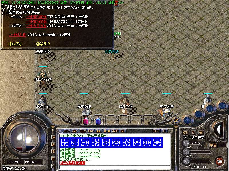 新手玩家请到祖玛打取祖玛装备换取元宝 新增终极之里和魔神绝地和神泣废嘘里面怪爆终极装备。