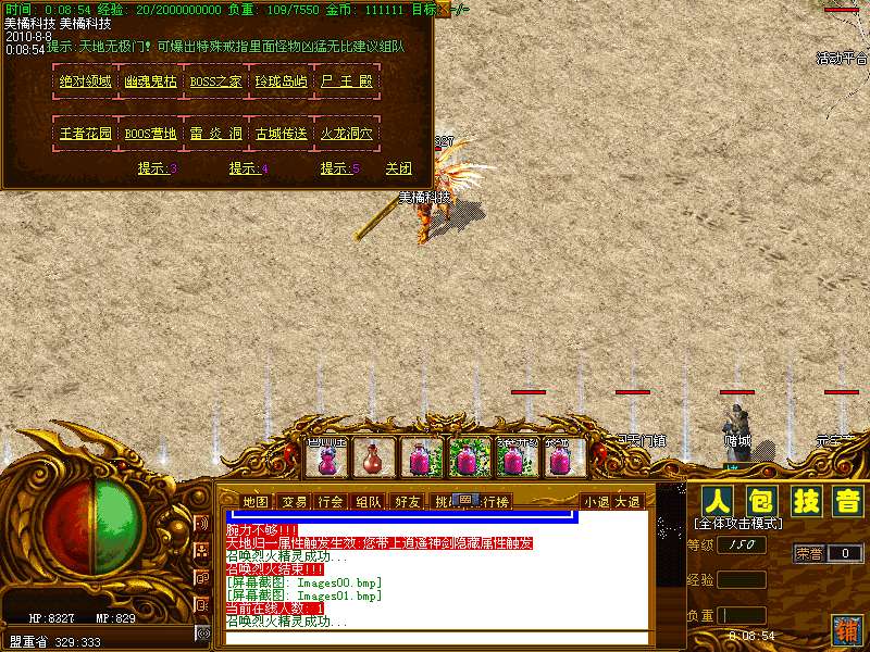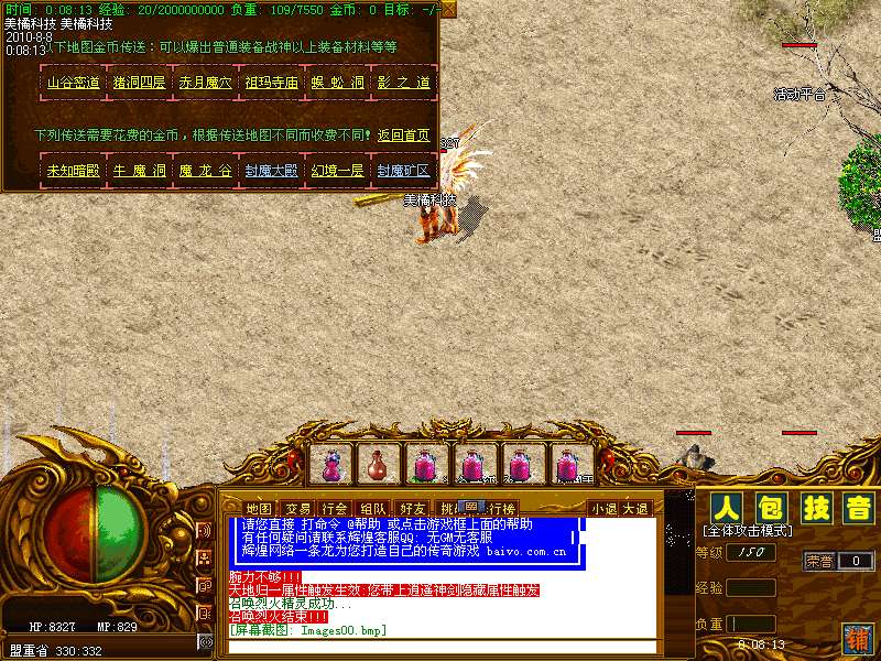 三:最新加入神秘古城事件 可以通过盟重传送员进入打开 装备地图就可以很清楚的看见[古城传送],神秘古城可以查询古城NPC他会提示您怎么 才能进入一个未知的世界那里面可以爆出高级装备爆率高。
