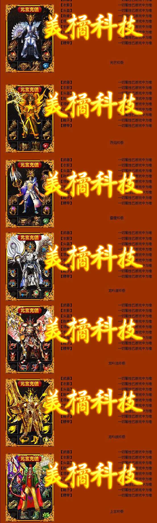 7.【PK赌装备】新增更有挑战性个人赌装备地图!从比武村里进入,在里面可以同别人发起个人 赌装备!也可以在里面显示你的PK技术!! 【装备合成】当你累计了一定数量的装备后可合成 更高一级的装备,比如2只(雷霆战戒)可以合成(雷霆战戒①),合到第十次为(雷霆战戒<终极>终极),第十一次为(龙吟装)。这种玩法可以让你玩上一两年也不会烦腻。装备好爆,练 级容易。