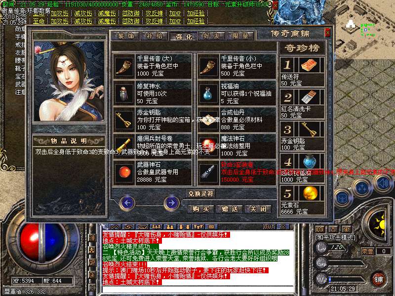 【游戏介绍】35级技能,以及狮子吼,无极真气,灭天火此类技能,需要在尸王店获得,每5分钟刷新一次!