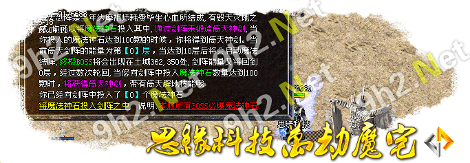 活动④:倚天剑阵,不断的向剑阵中投入魔法神石,达到100颗有机会奖励倚天剑一把,本服38个BOSS,每个BOSS必爆魔法神石一颗,每小时刷新一次BOSS.