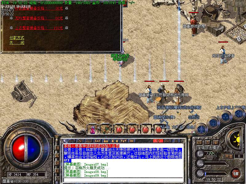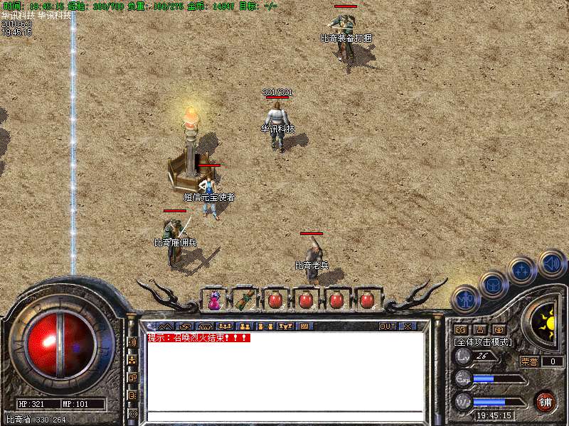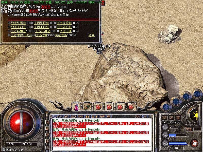 公告:看不到装备的朋友请到公告:高级装备攻略→上古合成(比奇城)→上古镶嵌(白日门)→2转装备(终极炼狱最后一层),每天中午12点30分举行年兽BOOS攻城,有几率爆出新技能