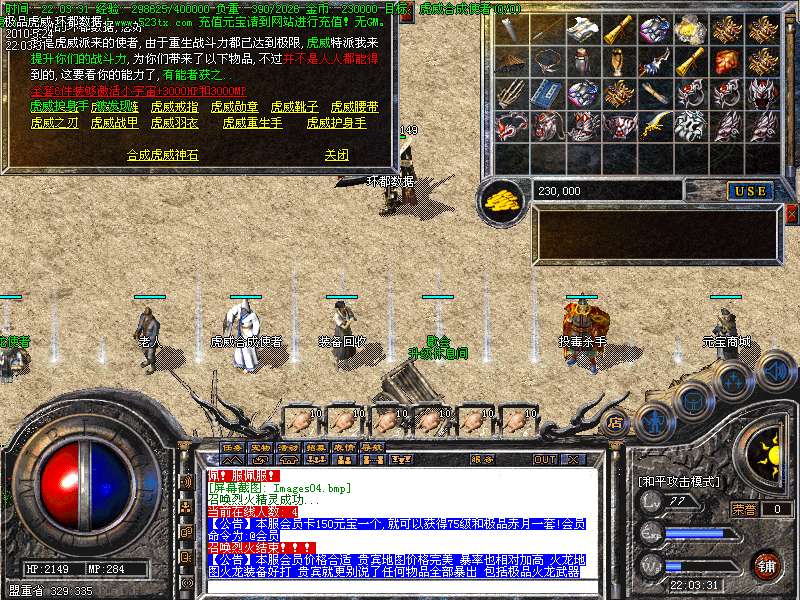 加入了盛大最新虎威装备,调整了赤月装备的爆率让玩家在装备上有了新的追求,技能方面增加了七