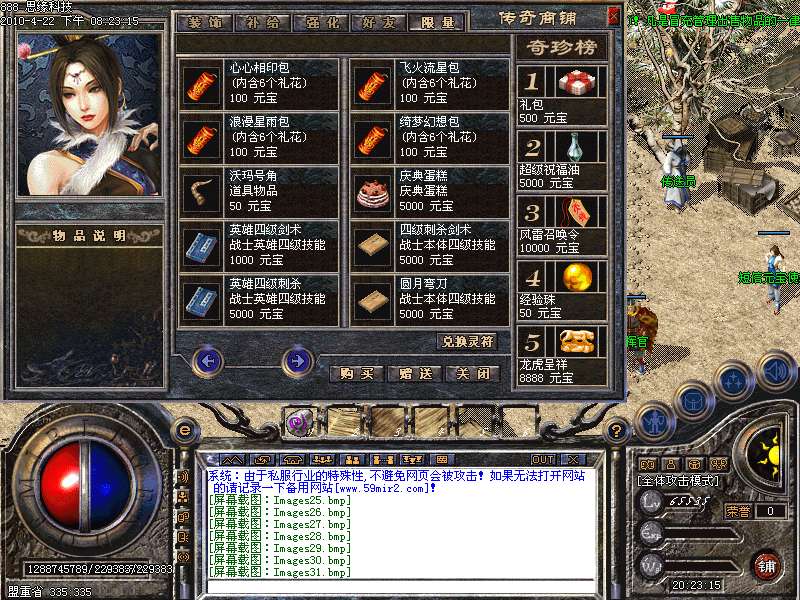 【重宝地图】本服务端特为广大GM增加目前最流行的地图 <众神归来>:此地图爆出炎龙,青龙,雷龙等装备 <万劫魔宅> :,荣耀,倚天等 <四级密室>: 此地图最新的四级技能
