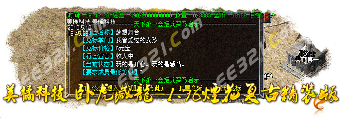 〖公告〗欢迎进入本传奇,我们力争保证:公平,公证,公开,认真对待每一个玩家。本游戏不设管理员,不卖装备,不调级,只出售元宝,为广大的玩家创造一个自己当家做主的传奇人的天堂!