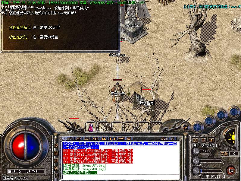 〖公告〗:非RMB得散人玩家注意了:你们可以去特殊地图打暗之怪物,可爆元宝,一般都是一个爆50,也会爆些逆火装备可以回收。有了300元宝就可以去雪域地图打逆火级和王者级装备,多的可以回收,在高级回收员那里,逆火5、王者20、金牛80并且有大量的经验哟。