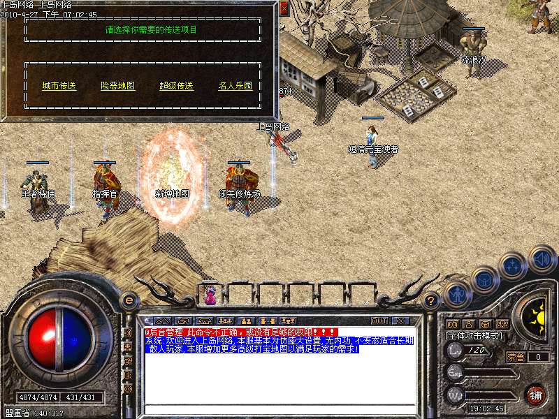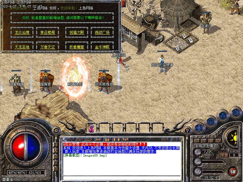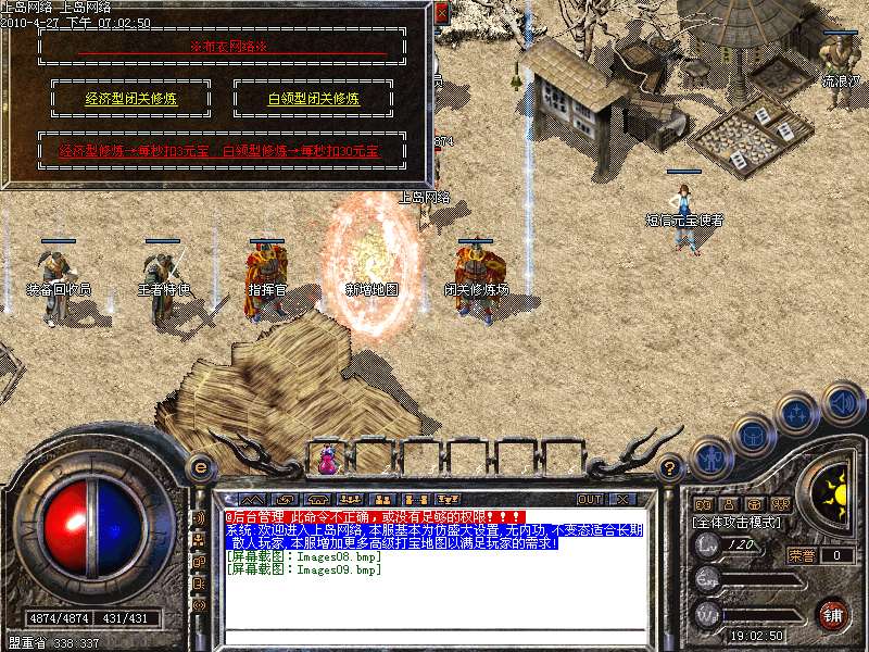 3.上线后可以在新人练级场,卧龙挖火龙珠,土城进入练级广场,闭关练级等处升级.