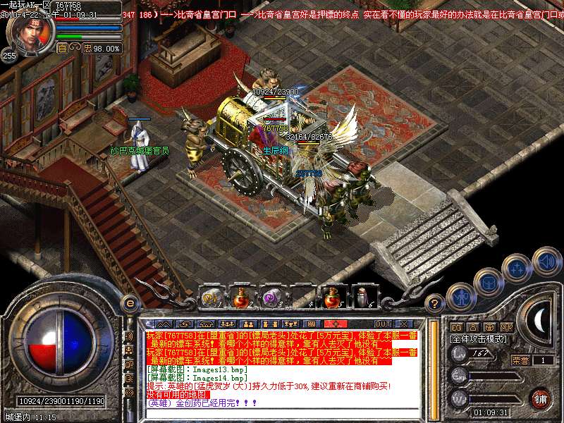 本服最新加入押镖和送战奴系统:此提示为押镖行会必定经过的坐标和地图路线:沙巴克皇宫—->盟重省—->盟重通道—->毒蛇山谷(打工集中营 413 565 )—->比奇省(347 186)—->比奇省皇宫门口 —->比奇省皇宫好是押镖的终点 实在看不懂的玩家最好的办法就是在比奇省皇宫门口或者毒蛇山谷通道的入口处等,镖车是肯定只有从那里过的。实在不行就只有拿下沙皇宫自己体验了呵呵~~~~~~~~~~~