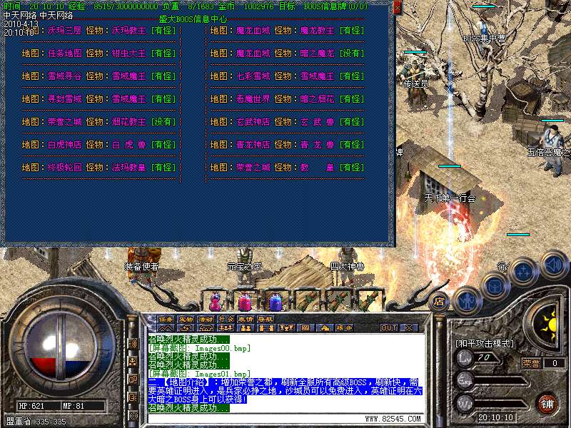 BOSS集中地:进入要求一层78级 刷 魔龙教主 暗之魔龙教主 珐玛教皇暗之赤月老魔 各种小BOSS