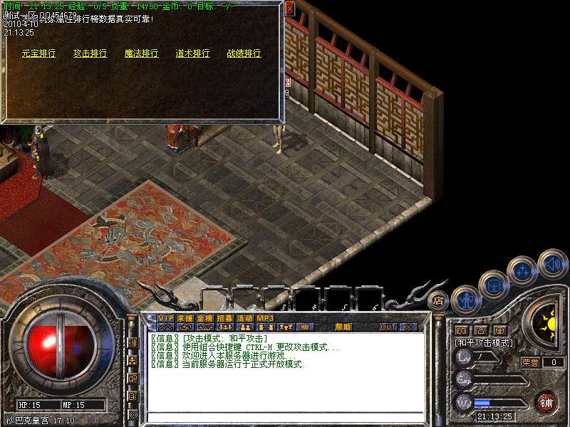 6.排行榜功能:目前开放了 元宝金榜,攻击金榜,魔法金榜,道术金榜,战绩金榜 每个金榜有显示7名玩家 系统自动每5秒更新,这个排行榜是显示全区最高