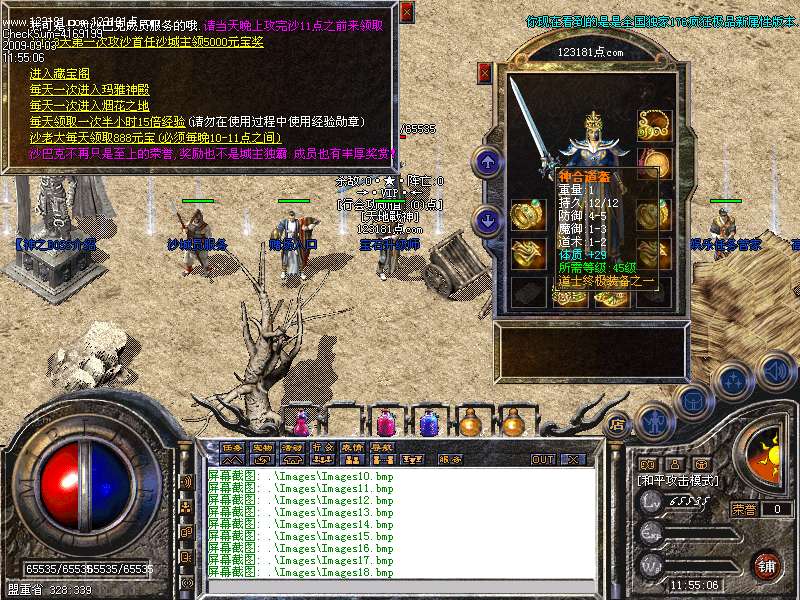 [151]开区第三天晚上举行第一次攻沙比赛。获胜行会奖励5000元宝.以后天天攻沙,天天有奖.激情永在!