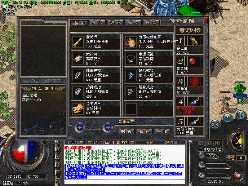 【神的恩赐系统】玩家可以在元宝商店使用获得<神的恩赐>,短暂的时间内激发自身潜能力量.增加人物死亡提示地图.坐标.方便丢了装备的快速找到该地点.