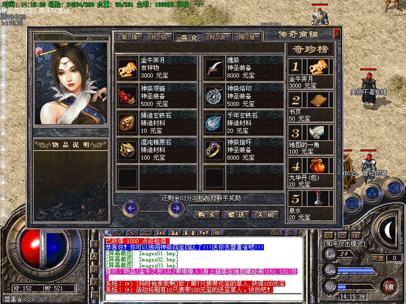 [250]特色三:本服所有物品均有爆出,地图的一角及书页本服所有怪物都有机率爆出.书页可以土城合成高级技能书,包括乾坤大挪移.护体神盾.擒龙手.逐日剑法.开天斩.无极真气.气功波.噬血术.灭天火.流星火雨等
