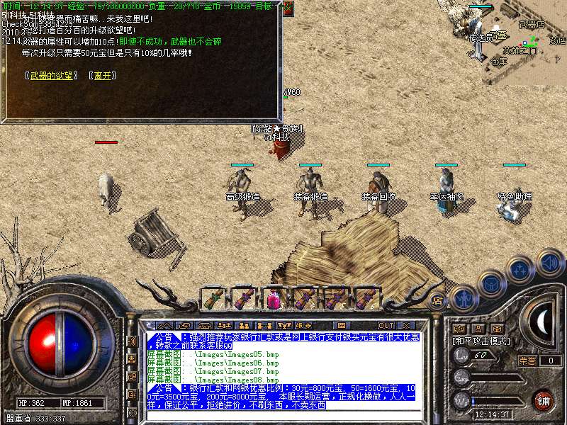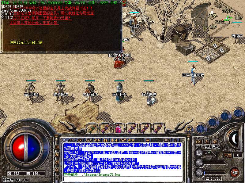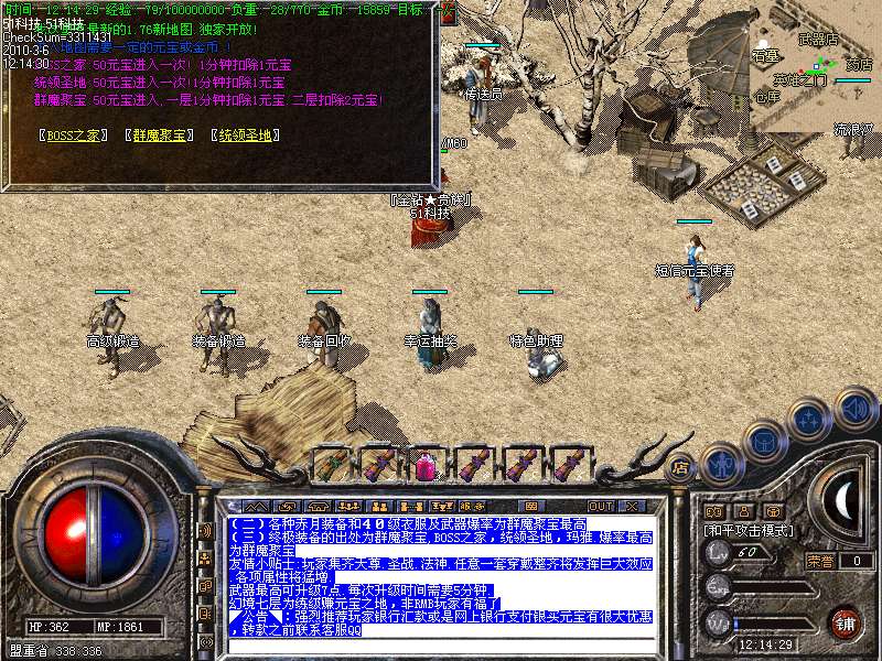 现在看到的是永不过时的最经典的老传奇版本.本版本挖矿.封挂.真正的还原传奇1.76版本元宝! 本服所有boss,30分钟刷新一次,大大提高了装备的暴率,更合理的设计,更永久的打算!进入冰宫的方法:可以从石墓直接跑到石墓10层,在石墓10层中间的冰宫看守处进入;也可购买猪八传送卷直接飞到石墓八层再跑下去! 开区后5天千人统一攻城战.沙城主奖励2000元宝! 公告:对本服务器有任何不明白的地方,请打“@帮助”命令,了解服务器的综合问题!本服地图和怪物设置全仿盛大1.76官方设置.关于暴率和地图的坐标有不清楚的玩家请打@帮助 查询. 登陆本服务器需要专用登陆器,否则不能登陆,是为了禁止外挂的出现,登陆器按F12呼出自带内挂,封穿人穿怪。各位PK高手请注意新增的游戏热键: Alt+S 道士下毒模式(互换,绿毒,红毒) | CTRL+V 切换小地图 | CTRL+Z 显示物品名称 | TAB 快速复制人名 | Alt+G 快速组队 | Alt+R 刷新背包 | Alt+Q 快速退出游戏各位PK高手请注意新增的游戏热键: Alt+T 交易 | Alt+S 道士下毒模式(互换,绿毒,红毒) | Alt+I 打开包裹 | Alt+P 组队窗口 | Alt+C 人物窗口 | Alt+V 技能窗口! 玩家和自己的恋人结婚后,除了可以查询伴侣的位置外,还可以使用[@夫妻传唤]指令把恋人传唤到自己身边。请玩家保护好自己的帐号和密码,不要告诉任何人(包括GM)GM无需找任何人索取帐号和密码,如装备被盗,被骗,请立即用密码保护在登录器上找回. 如果你在游戏中发现任何漏洞,请告诉我们,只有你们的支持,我们才会做得更好!走的更远. 本网络服务器为散人服务器,谢绝家族进入收人发群号,如果不听阻告进F的,将被封号处理!武器最高可升级7点.每次升级时间需要30分钟. 本服务器禁止任何外挂,发现使用脱机等外挂者,不管是否花钱,立即永久封号!举报者有元宝奖励!友情提示:人物红名死亡或者回城将进入恶人谷,下方的门可进入万恶之源打宝地图!新区不出售装备,购买元宝请使用元宝自动冲值
