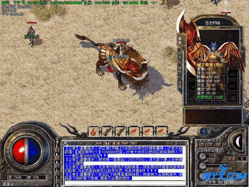 温馨提示:开区第2天晚上7点到9点举行沙城争霸赛,沙老大将获得【城主骑甲2个】+100000元宝,沙老大也可以把该区的奖励转入下一个新区拿30000元宝!!