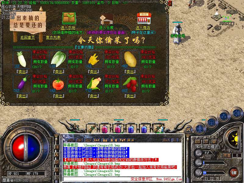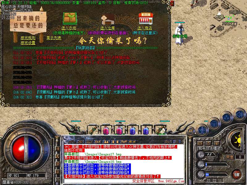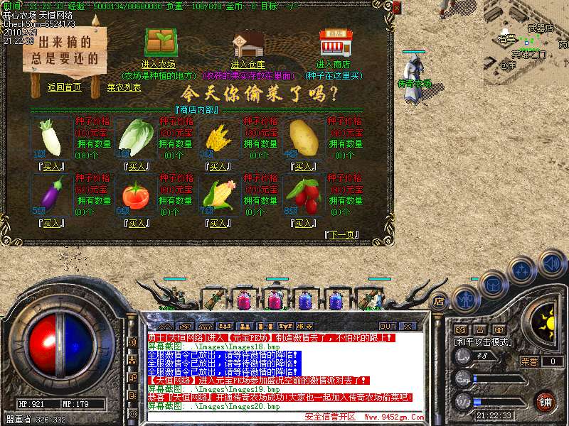 1;传奇农场;增加了最潮流的传奇农场,每偷取,摘都能加种植经验,只能偷在线玩家成熟的果实,种植级别越高,种品种的越多,能偷的种类也就越多,收获的果实,可以换元宝,换装备。