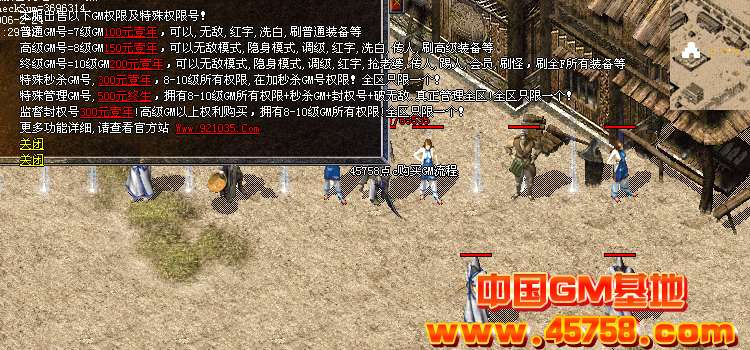 中级GM权限号 150元/年 主要功能:无敌 隐身 刷装备 发红字 跟踪 传人 复活 等!更多功能请查看GM命令表