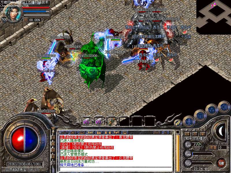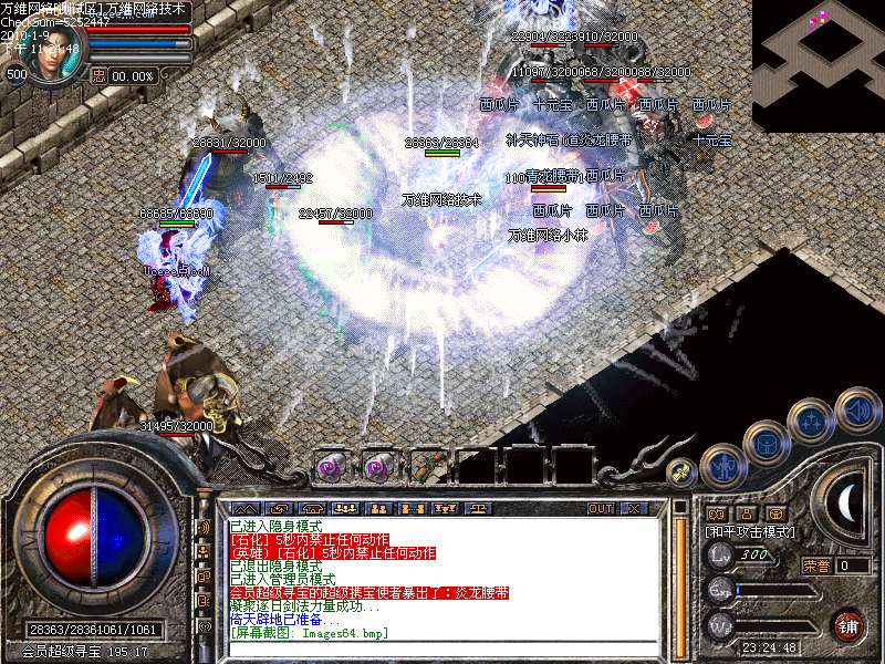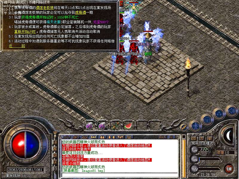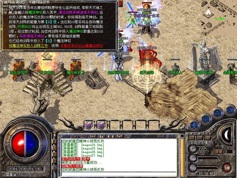活动④: 倚天剑阵,不断的向剑阵中投入魔法神石,达到100颗有机会奖励倚天剑一把,38个BOSS,每个BOSS必爆魔法神石一颗,每小时刷新一次.