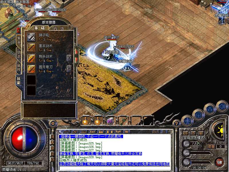 四级技能(英雄一样):四级基本剑术,四级刺杀剑法,四级圆月弯刀,四级雷电术,四级流星火雨,四级施毒术,四级噬血术