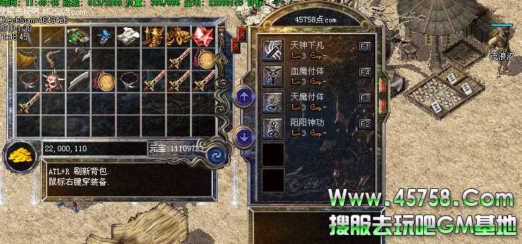 【神的恩赐系统】玩家可以在元宝商店使用获得<神的恩赐>,短暂的时间内激发自身潜能力量.增加人物死亡提示地图.坐标.方便丢了装备的快速找到该地点.