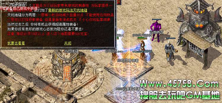 【特色地图】天坑地缝(刺激好玩), 神兵天下(爆武器的好地方),困兽之斗(激情PK抢怪打元宝的好地方)。