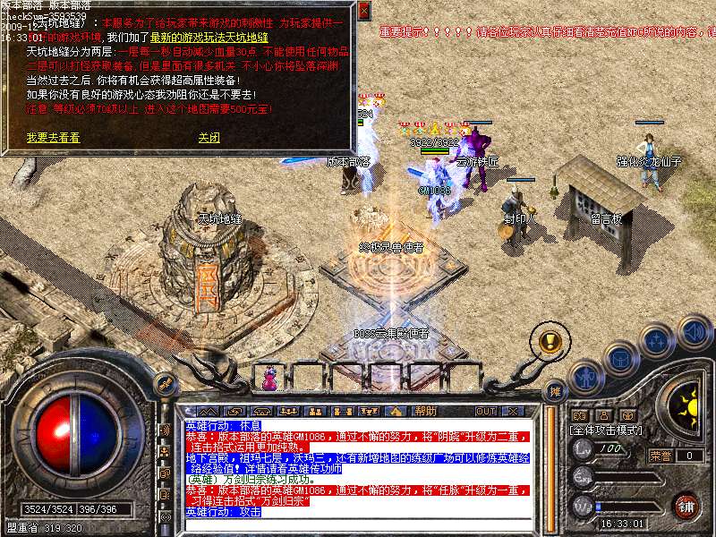 特色地图:天坑地缝(刺激好玩), 神兵天下(爆武器的好地方),困兽之斗(激情PK抢怪打元宝的好地方),炎龙金牛神殿,终极灵兽使者,黑暗之地等等