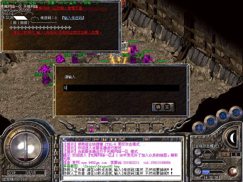 1;防假人工作者必须指定时间内输入NPC提示的游戏验证码,否则踢下线。