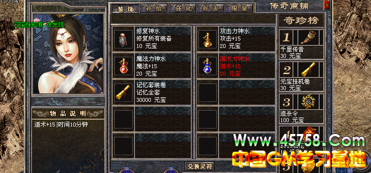 6:本服无特殊戒指,为了能更好的团队作战和团队打宝,本服只开通记忆套传送,可以更快的进入打宝地图,散人玩家可以借助传送符进行地图传送,自己挑战超级BOSS要特别需要耐心,但是报酬是相当丰厚的撒!~~