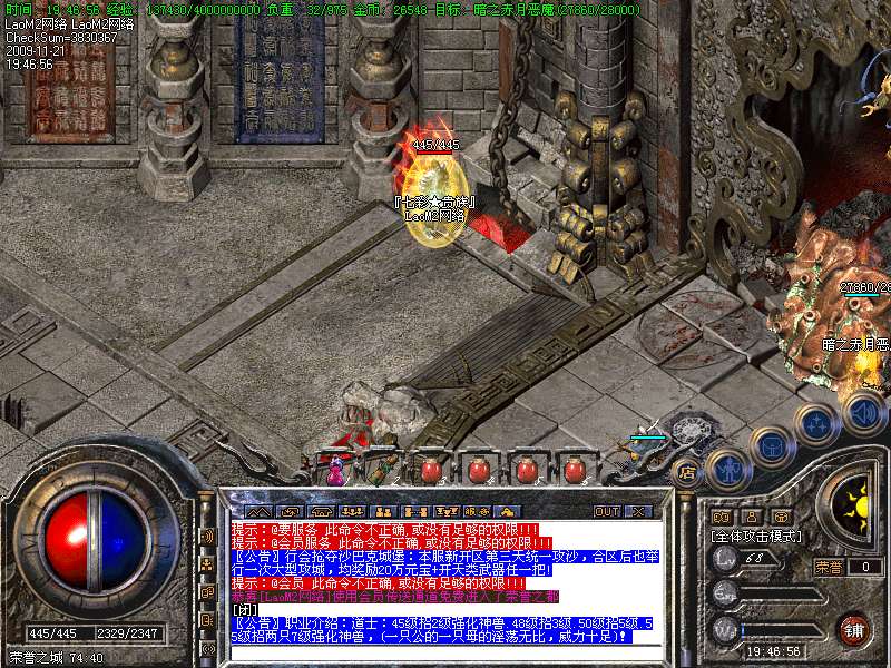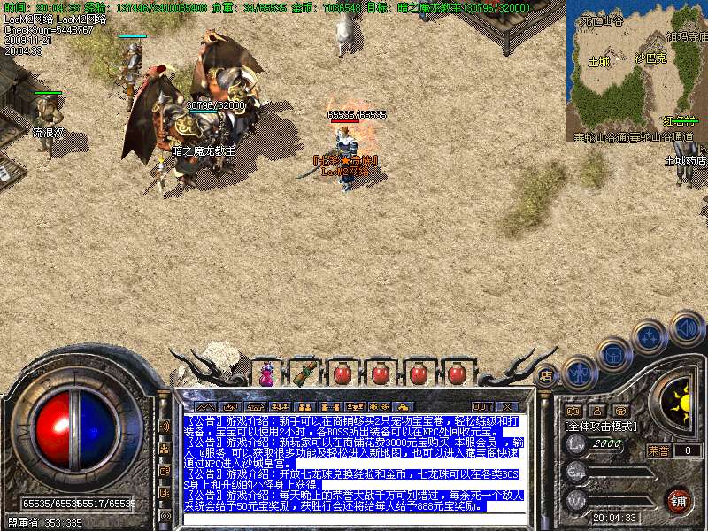 3.新颖特色:“单挑赌命”“追杀仇人”“行会PK召唤”“荣誉大战” 4.丰富的升级奖品:45级以后每升一级系统将会奖励,元宝.经验.装备 5.新增加特色地图:六道轮回.牛逼天堂,荣誉之城,命运之门挑战性极高 6.20点开放荣誉大战在此地图杀一个人奖励50个元宝,获胜行会每人888元宝 7.系统每天下午14点准时开放群英大会,胜利者可获得2888元宝奖励 8.开放小极品.新元素的暴率,武器最高为10点,首饰最高为4点绝不BT