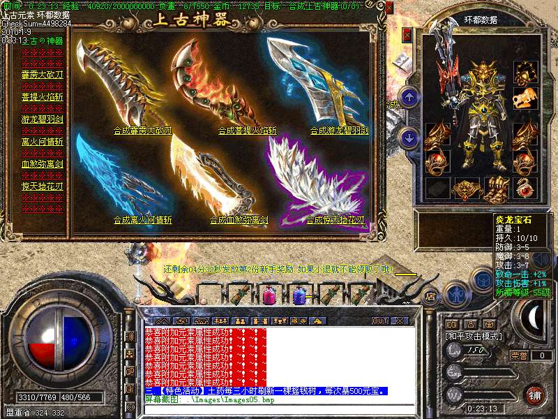 5;增加上古神器系统,可视化合成,新颖耐玩,合成6件新武器,眩目的外观,超然的属性。通过NPC打造合成出来(请看游戏截图有介绍)。