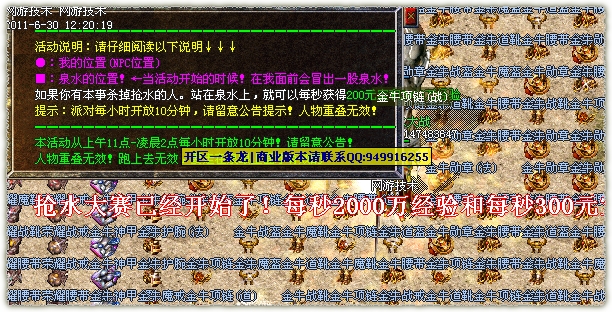 活动不断:每隔30分钟土药刷元宝神龙,每隔一个小时土药激情抢水,每隔40分钟刷3只主宰元神,每隔一小时刷传奇之帝