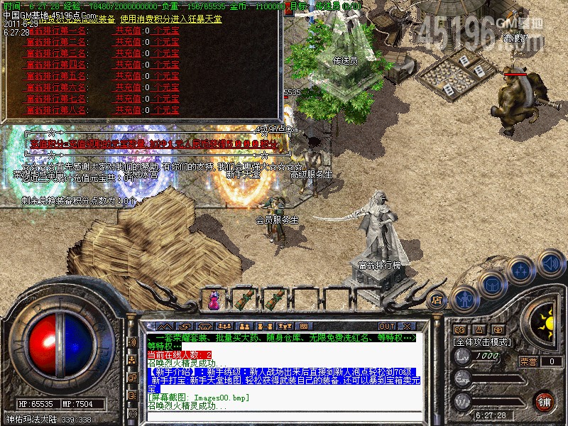 【新手介绍】:新手练级:新人战场出来后直接到新人泡点轻松到70级. 新手打宝:新手天堂地图.轻松获得武装自己的装备.还可以暴到宝箱卖元宝.
