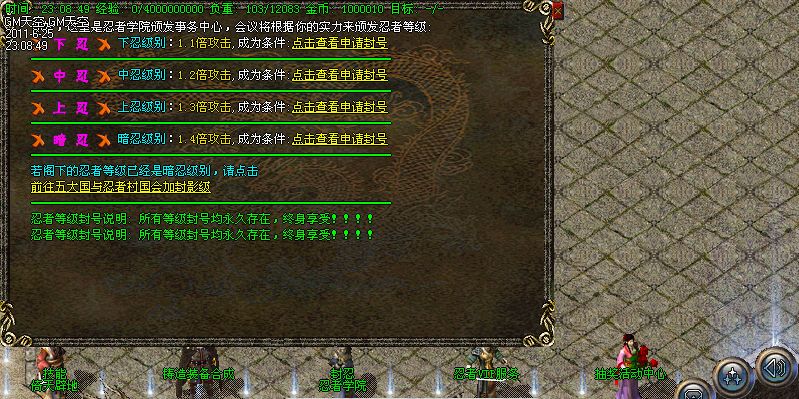 【影级设置】 本服的忍者等级分别为:下忍,中忍,上忍,影级分别为:土影|风影|水影|金影|火影|冰影|雷影|万众绝影