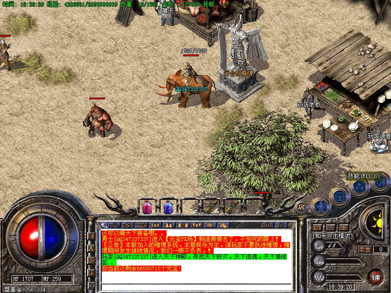 <255,220>〖公告〗欢迎进入本传奇,我们力争保证:公平,公证,公开,认真对待每一个玩家。本游戏不设管理员,不卖装备,不调级,只出售元宝,为广大的玩家创造一个自己当家做主的传奇人的天堂!