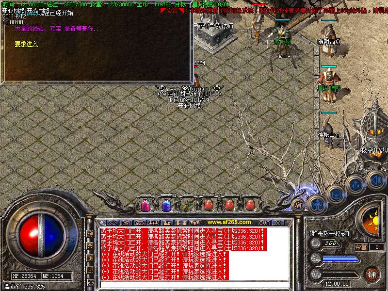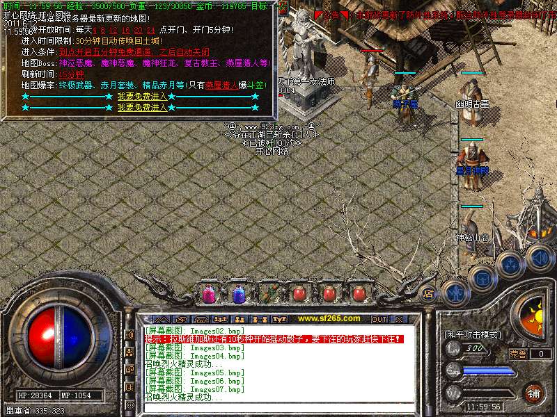 每日活动:每天中午12点、晚上18点、晚上24点,举行在线活动││免费传送到:在线活动场,大量的元宝、经验、装备等着您!每天早││上9点-下午15点-晚上20点举行行会争霸活动,获胜行会奖励3000元宝││活动都会有系统提示,请玩家准时守侯参加!