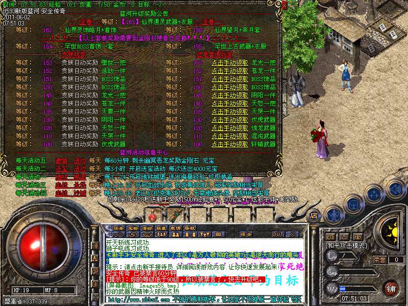 【活动提示】本服24小时活动.激情不断.每30分钟土药送金刚石 每2小时蓝河送宝 每3小时开启地狱城堡 每天19点血战杀场.