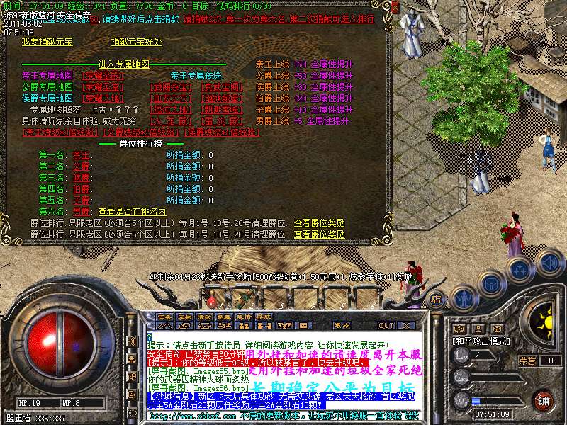 【爵位专属】亲王.0.2倍属性提升.公爵0.1倍属性提升.侯爵.30属性提升.专属地图 掉落上古神器 上古神铠 刷有大量BOSS.详情查看NPC.爵位排行.