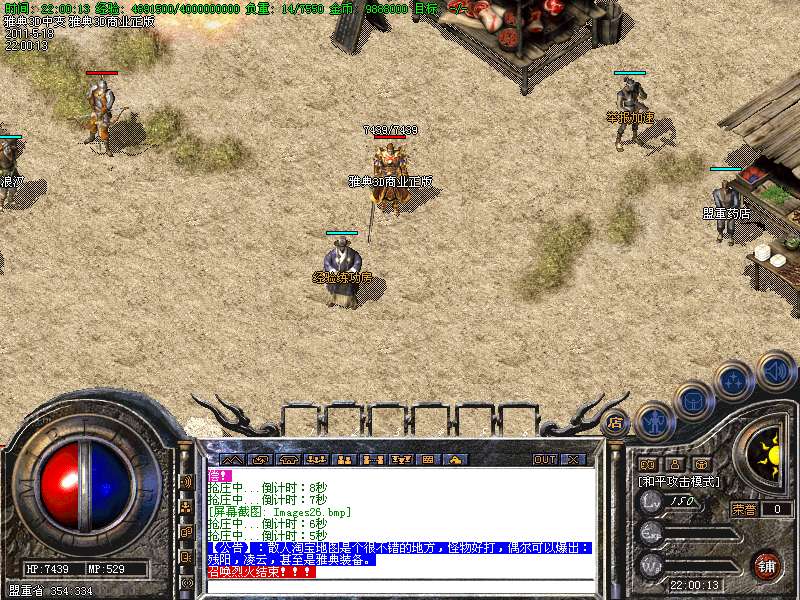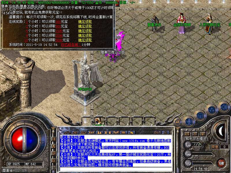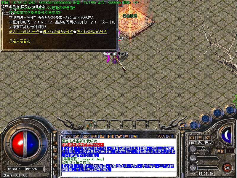 【特色6】;游戏行会战场两小时举行一次,可以进去半个小时,每30秒增加100点荣誉值和300万经验,荣誉值可以直接换元宝。