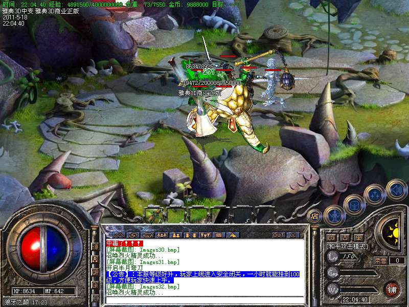 【特色10】;游戏三职业平衡,加强了各职业新技能。道士90级,100级,110级,120级,130级,150级宝宝分别为:雅典寒冰魔,雅典战将,雅典侍卫,雅典刀客,雅典主宰者,火云邪神,属性非常牛比。